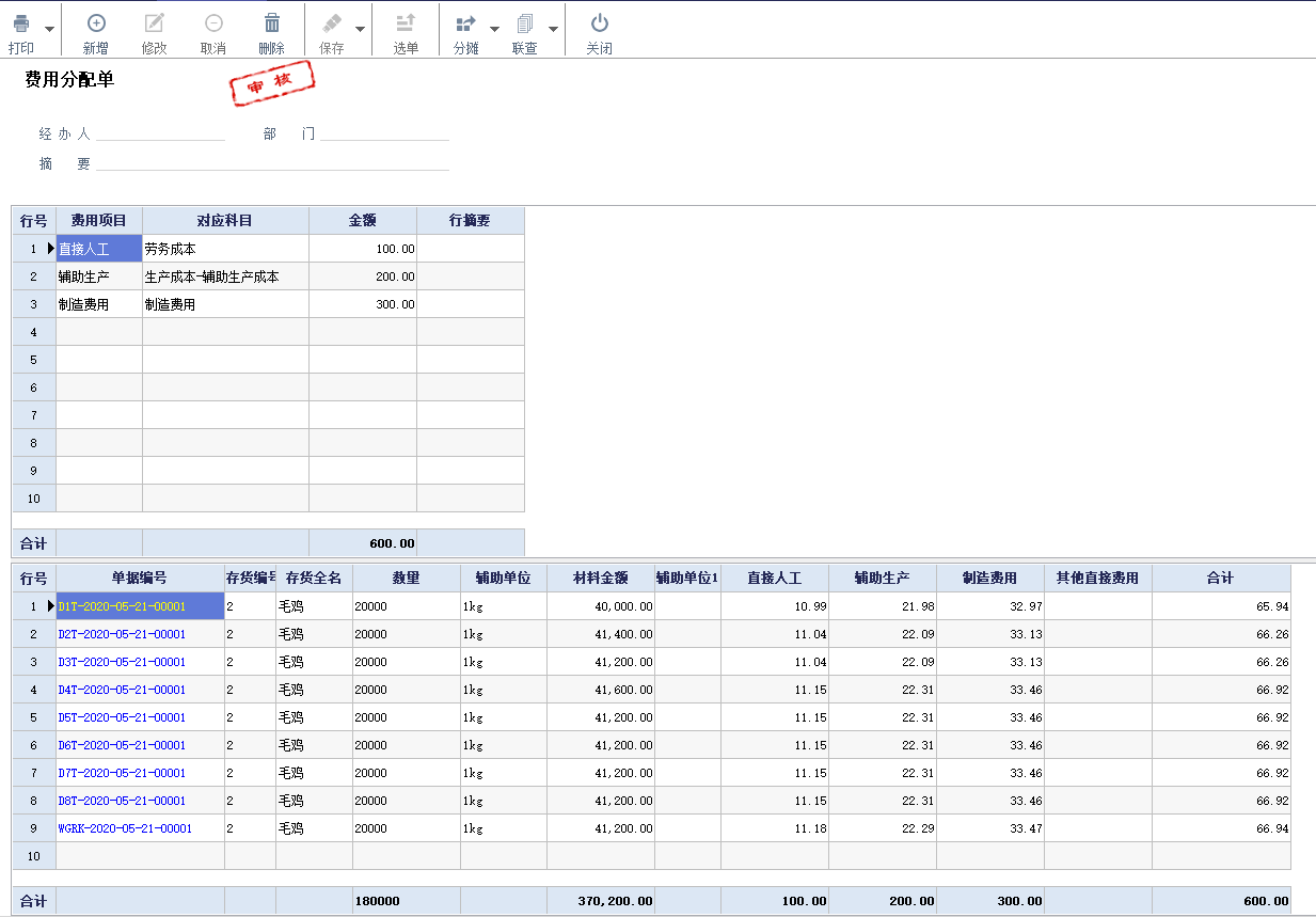 費用分攤:養殖業每天發生一些其他費用,例如水電、人工等等費用,這些費用可以在月末的時候進行記錄,并分攤到我們養殖完成的成品中去,也可以分攤到每天的單據中去,形成完整的每日成本。