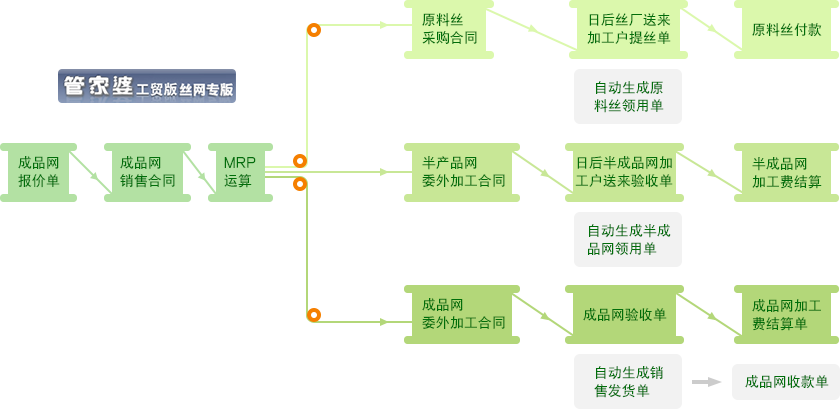 為了讓絲網(wǎng)行業(yè)更好的實(shí)現(xiàn)信息化管理,根據(jù)這些特點(diǎn),管家婆工貿(mào)版開發(fā)了絲網(wǎng)專版,針對絲網(wǎng)行業(yè)進(jìn)行了不少的細(xì)節(jié)優(yōu)化,例如:進(jìn)貨自動生成委外領(lǐng)料,完工自動生成銷售等等,方便了用戶使用,準(zhǔn)確記錄了各個環(huán)節(jié)的數(shù)量,提高了工作效率和準(zhǔn)確率,受到了絲網(wǎng)生產(chǎn)廠家的歡迎。