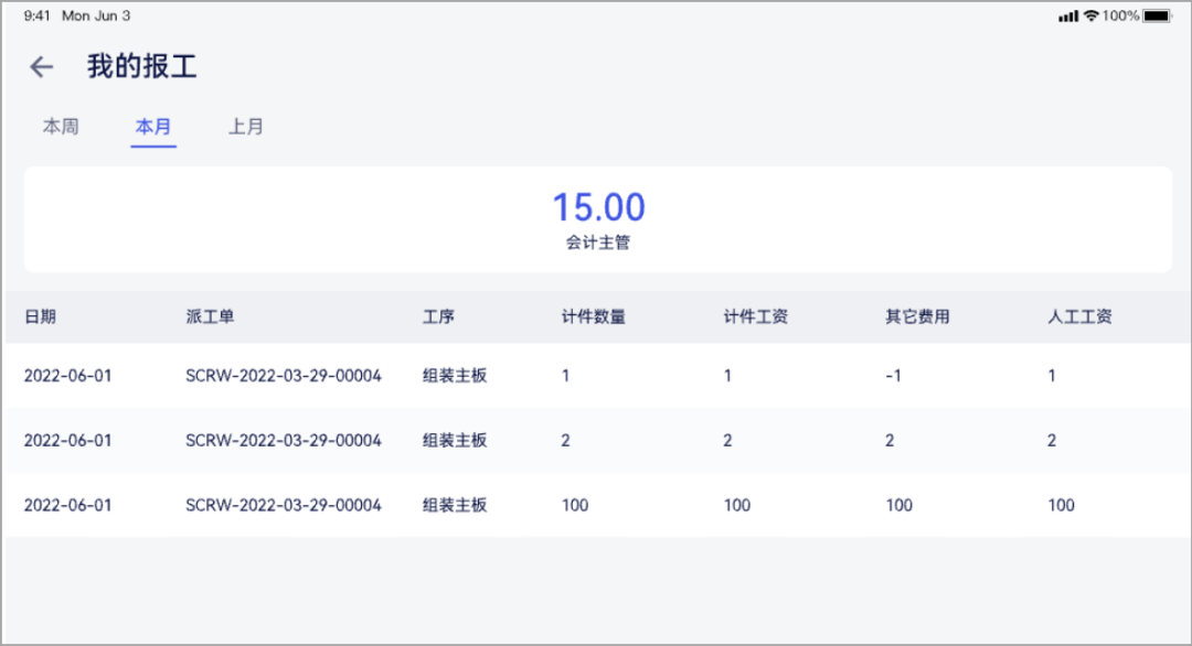 我的頁面中,增加我的報工查看,可查看操作員本周、本月以及上月的計件工資,同時可查詢計件工資的組成明細。