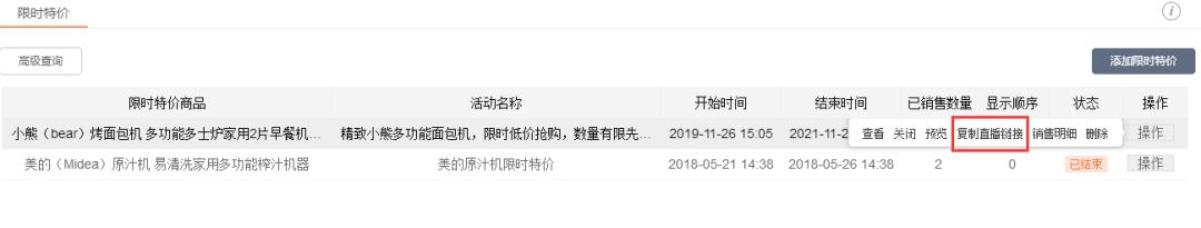 對正在進(jìn)行限時特jia、拼團(tuán)活動中的商品,在直播時可復(fù)zhi活動鏈接到直播平臺進(jìn)行推廣,也可用非活動鏈接進(jìn)行商品正常售價直播;促銷中的商品直播時則自動顯示活動價