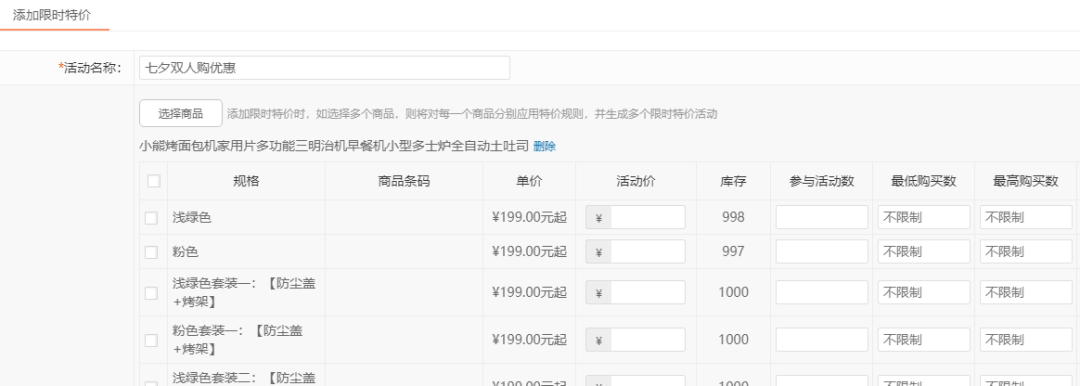 添加限時特jia時,可一次性選擇多個商品;簡化zui低、zui高購買數(shù)量限zhi;去掉上傳限時特jia商品列表圖片要求;限時特jia商品列表的活動名稱改為顯示商品名稱